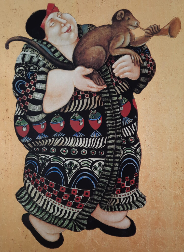 - Ada’s werk valt op door de kleurige fantasiewereld en een terugkerend thema van de volumineuze, glimlachende vrouw. Deze vrouwfiguren zijn vaak in levendige, decoratieve omgevingen geplaatst met motieven zoals bloemen, vissen en dieren, wat symbool staat voor vitaliteit, vruchtbaarheid en levenslust.