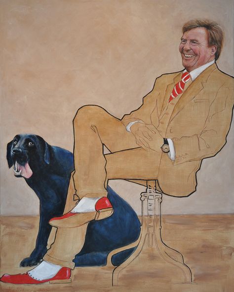 Ze maakt grote kleurige doeken, vaak met realistische portretten gecombineerd met grafische elementen. (Regentenkamer)